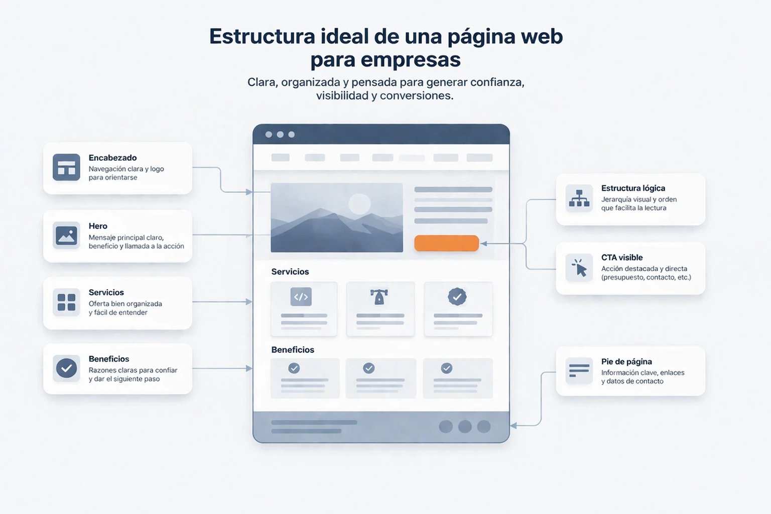 La estructura ideal de una página web para empresas no consiste en meter muchas secciones, sino en ordenar bien las correctas. A continuación, te propongo una estructura base que suele funcionar muy bien en webs corporativas, webs de servicios y páginas orientadas a captación de leads.