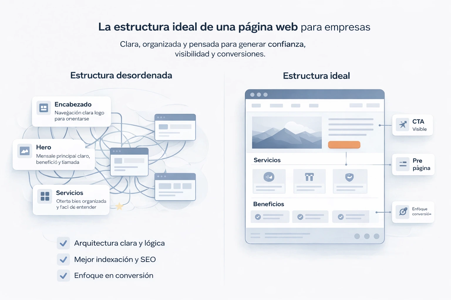 La estructura de una página web no solo afecta a la conversión. También tiene impacto directo en el posicionamiento orgánico y en la interpretación semántica del sitio.
